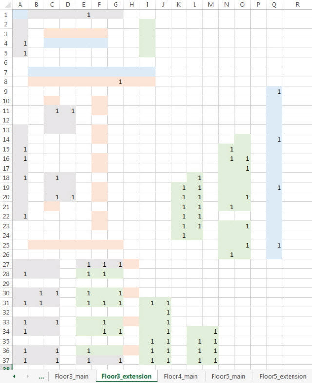 The Excel file used for data entry was structured and color-coded so that it looked like the floor maps. Because of the way the data was collected and entered, I was able to see patterns emerging early on in the project, which helped me identify potentially interesting areas for analysis.