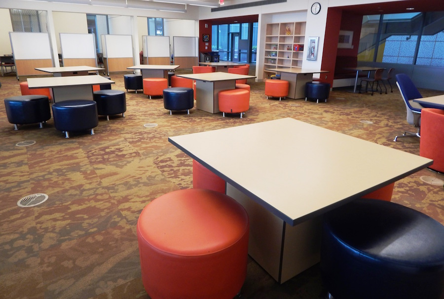 This difference in how the library is used throughout the day, coupled with insight relating to group and individual use, has made it clear that the flexibility of our spaces is very important. The data indicate that students sat individually slightly more often than they sat in groups. Also, 60 percent of the students who sat together were actively collaborating, while 40 percent of the students sat together but appeared to be working on their own. These are significant results because two-thirds of the library was designed to be collaborative in nature, while one-third of the library was designed for individual use, which may indicate that we overestimated the amount of library space needed for collaboration. Because most furniture is mobile, however, individuals can easily modify a collaborative environment to meet their own needs; they can break apart tables, pull chairs from a group cluster, or use mobile whiteboards to create a room on-the-fly. Going forward, student needs and behaviors could change, and again, the flexibility of this space would likely minimize the impact of this change.