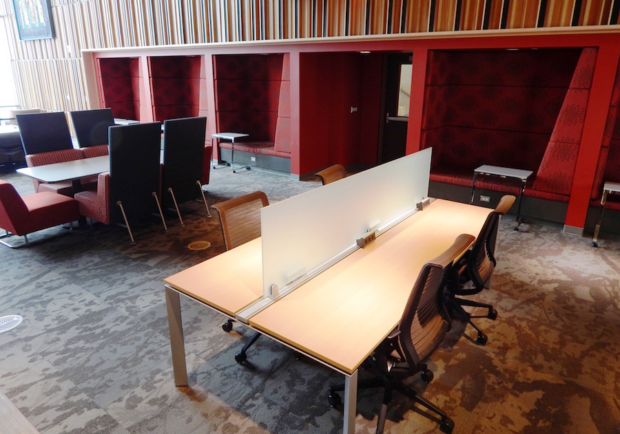 More space at the front of the building: a lounge space with a variety of soft benches and carrels on the main floor, and a mix of carrels and group study tables on the other floors.