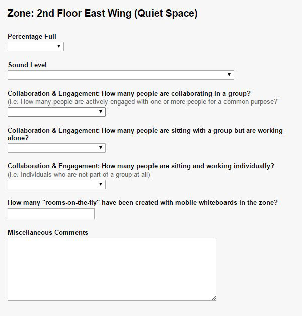 The Google form worked well for our original purposes—it was easy to create and modify, and because we were not collecting private or individual information, data security was not a priority. The form divided the library into zones and asked questions aimed at discovering what we wanted to know about how the building was being used. The first question asked students to indicate how full each zone was. While we initially designed the form to use exact numbers or headcounts here, after testing the instrument, we decided to instead include the following options: totally full, mostly full, half full, a few students, and empty. Because the library often has six hundred to nine hundred students at once in the building, this decision significantly reduced the time it took our student employees to complete the form and, in turn, minimized disruption to student patrons. Additional fields included the following: