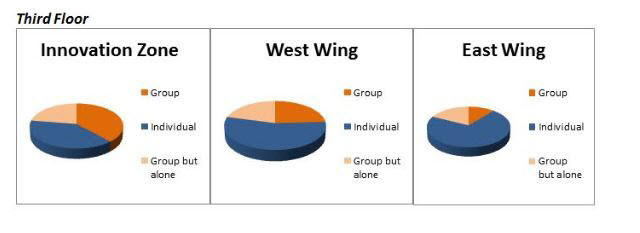 The base for my analysis was to look at how many seats were occupied and divide that by the number of seats that were available, resulting in an occupancy rate. If eight out of ten carrels had check marks, it would be an 80 percent occupancy rate. Space described as “more popular” had a higher occupancy rate; fewer seats went unused.