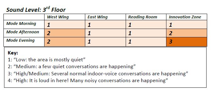We were also able to break down the sound level results by peak versus non-peak times and by time of day. This analysis was important to us—if no one is talking in a space that is fairly full, that indicates that most students are using that zone as quiet space, which is more meaningful than if no one is talking in a space that only has a few people in it. Similarly, the time of day analysis allowed us to get a more accurate understanding of how the library changed throughout the day. We also broke down fullness levels and type of study by time of day.