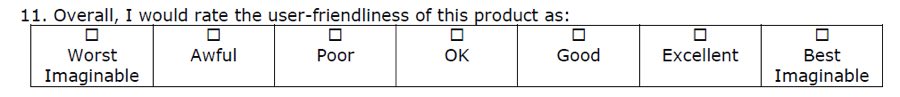 Research indicates that minor modifications can be made to System Usability Scale without changing the results. Bangor, Miller, and Kortum (2009) conducted testing where an additional adjective scale was added as an eleventh question to the SUS and administered to 964 participants. The purpose of this addition was to address the question, “what is the absolute usability associated with any individual score?” (Bangor et al., 2009, p. 117) The question asked participants to rate the user-friendliness of a product or website as worst imaginable, awful, poor, OK, good, excellent, or best imaginable. Findings indicated that the scale ratings were a close match to SUS scores and the inclusion of an additional scale may be useful for providing a “subjective label for an individual study’s mean SUS score” (Bangor et al., 2009, p. 119).