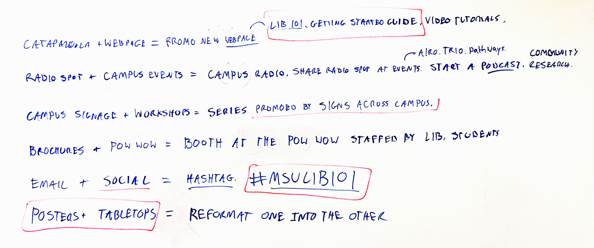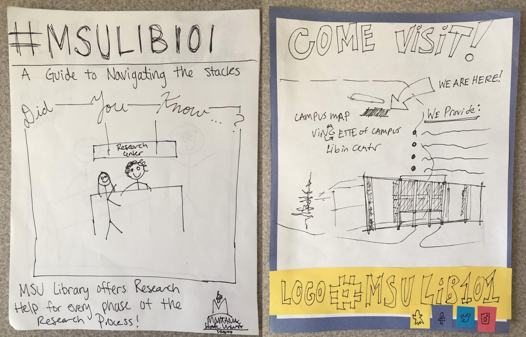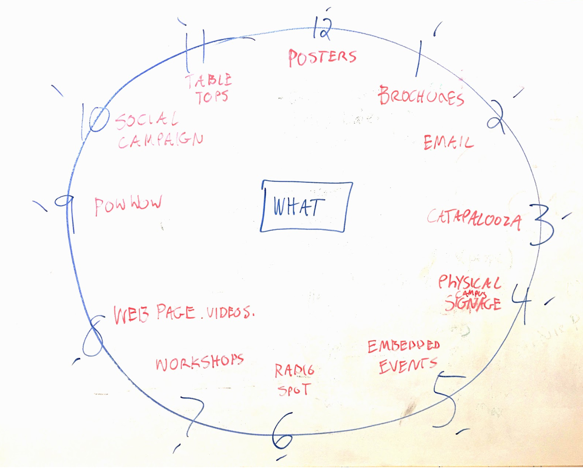 To facilitate the process of selecting the exercises, Celina and I met additionally every week for in-depth analysis of the evidence produced through the exercises. We discussed the most appropriate next steps given what had been generated so far. The exercises in our process were all drawn or adapted from the design resources listed in the “Tools and Techniques” section below. We then presented informal reports to the group that summarized our progress and recommended one or two possibilities for subsequent exercises. I facilitated these conversations among the participants. As the library professional, I was conscious of my power and status in the group. Throughout the process I acknowledged my power vis-à-vis the students, with a view towards the power-sharing and co-creation principles of participatory design. I was careful to create space for the student voices and to meaningfully and equally integrate all of our viewpoints into the decision-making process. In practice, this meant that I had to listen closely to the students and remain attuned and responsive to their wants and needs. When there was disagreement, we continued our discussions until all participants were satisfied with the agreed-upon next step. For example, I had initially assumed that the group would ultimately generate a digital product in support of our Native population, such as a new web application that would reach and engage students. This assumption derived from my professional background and bias as a web-oriented librarian. The students, however, asserted through the design process that a poster campaign would be more effective for reaching the Native population. As we moved from Stage 2 to Stage 3, we examined the evidence together with our personal experiences and viewpoints, and agreed together that the printed posters would be a more effective engagement tool, and so the posters became the focus of our Stage 3 exercises.
