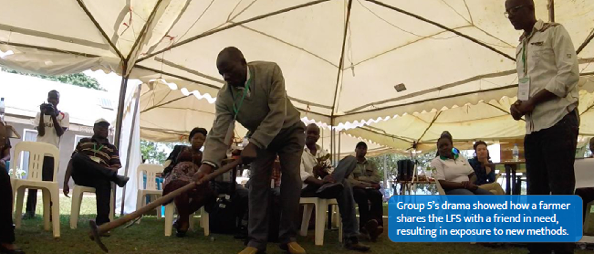 While together with the community in Uganda we ran some initial user mapping. We designed this process based around theater roleplay where farmers and delegates acted out how they might access, contribute to, and interact with the Library for Food Sovereignty (A Growing Culture & CauseLabs, 2016, slides 8-11). Farmers and delegates broke into groups and were asked to create a short skit that explored these three processes. Everyone enjoyed this exercise and took it seriously. The farmers and delegates illustrated a variety of challenges and opportunities relating to how they might discover that the library existed, how they would learn to use it, and what the incentives to contributing might be (fig. 2).