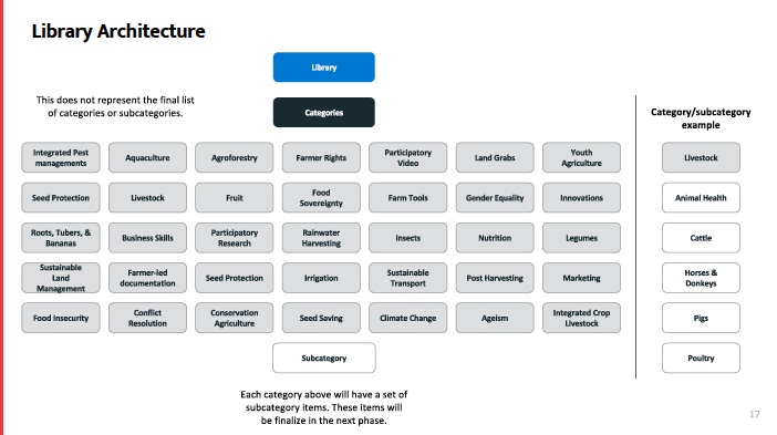 These innovations, specifically the ones that affronted ways for resolving socio-cultural challenges, often took the form of inspiring stories. These stories had the potential to stimulate the innovation process and in that sense, were a key part of the project’s ability to support farmers to create a healthier and just food system. This takeaway also had a big influence on how the library interface was structured moving forward (fig. 3).