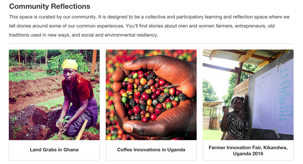The crucial revelation that not all local innovations addressed technical challenges of farming led us to design a section called “reflections” where communities could share their stories (fig. 5). This section could be curated around themes such as “land rights” or “Indigenous land management” or “food sovereignty.” Additionally, we developed a tagging/naming system where categories and sub-categories were not limited to technical terms such as “beekeeping” or “agroforestry” but also “gender equity” and “young farmers.” We considered this essential because the stories of overcoming hardship oftentimes catalyzed an innovative process in communities and inspired others.