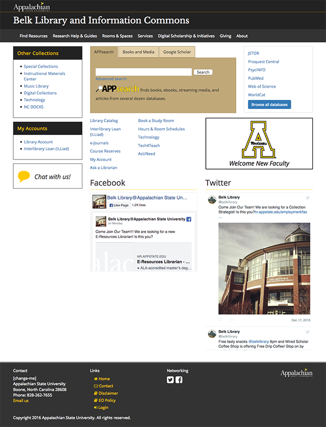 The A/B testing discussed in this article occurred after Appalachian State University’s main library website was redesigned and migrated to a new Drupal theme in August 2017. Leading up to the launch, members of the library’s Web Content Committee had conducted an electronic survey, which included an open and closed card sort implemented with the “Pick, Group, and Rank” question type in Qualtrics. Card sort data indicated there was a need to better organize our content relating to our spaces. Previously, information on the website relating to our rooms and spaces was situated in the “Services” menu item. However, from our card sort we realized that this type of content would be better categorized in a standalone section of the website. In addition, the library had been undergoing a major space renovation. More space for students was being created, the Writing Center was relocating to another floor, and other spaces such as our makerspace and video recording room were being created or expanded. A “Rooms & Spaces” menu item was seen as an important design decision to better inform our users of the changes taking place in the building.