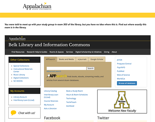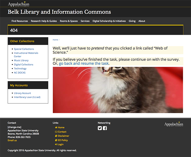 Qualtrics was the mechanism through which we recruited participants, but it also enabled us to link together the survey data with data from the browsing session. While we could have used IP addresses or a service like Google Analytics to achieve the same thing, we wanted to keep the survey truly anonymous. This was important to us because if respondents could be identified, we would be obligated to provide information on how their session was being tracked, which might have affected the response rate or the informality we were trying to convey as they approached the tasks. The nature of our project was such that it was limited in scope to gathering data about Appalachian State University users. As that data could not generalize to other populations, it was not subject to human subjects review. However, those wishing to utilize a technique like the one described would be wise to consult with their Institutional Review Board chair or administrator. For details on how we associated a respondent’s survey with his or her browsing activity, see the Appendix.