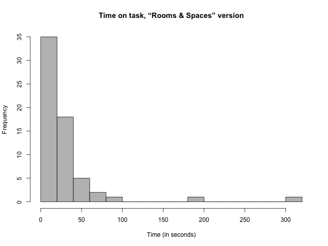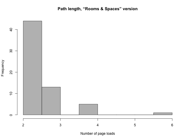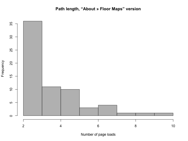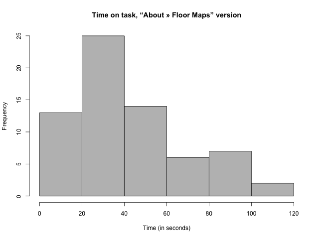 The other metrics we collected, time on task and path length, showed significant differences between the two conditions. When floor maps were featured under the “About” page, respondents took longer to complete the task and required browsing through more pages. These two metrics are represented as histograms in figures 4–7. Note that they are right-skewed, meaning most of the data points are at lower values, unlike a bell-shaped normal distribution. To determine if the two groups were statistically different, we used a Mann-Whitney test, which does not assume that the data come from a normal distribution. This test confirmed that the differences between the two conditions were statistically significant across both metrics.